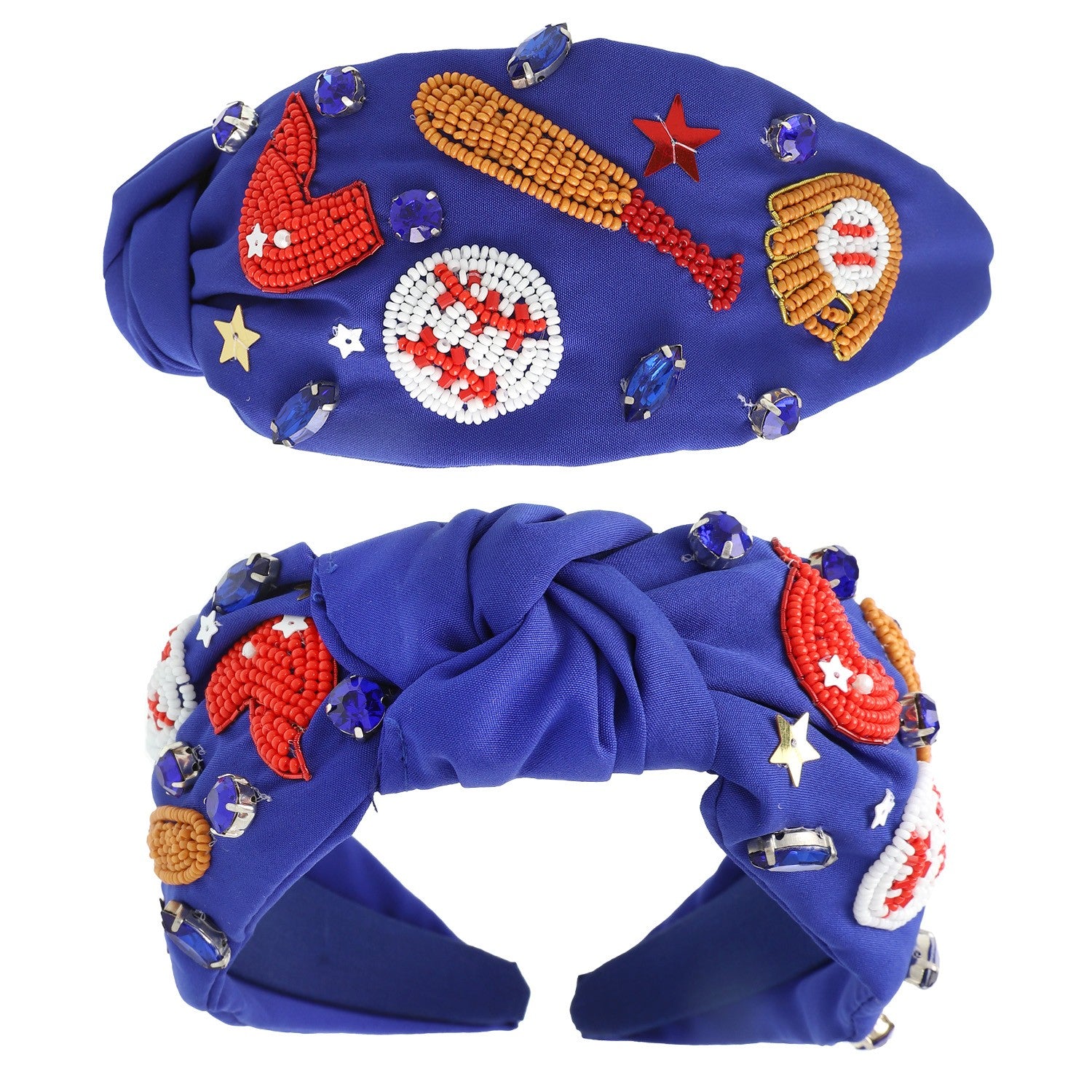 Baseball Top Knotted Jeweled Beaded Headband- Royal Blue