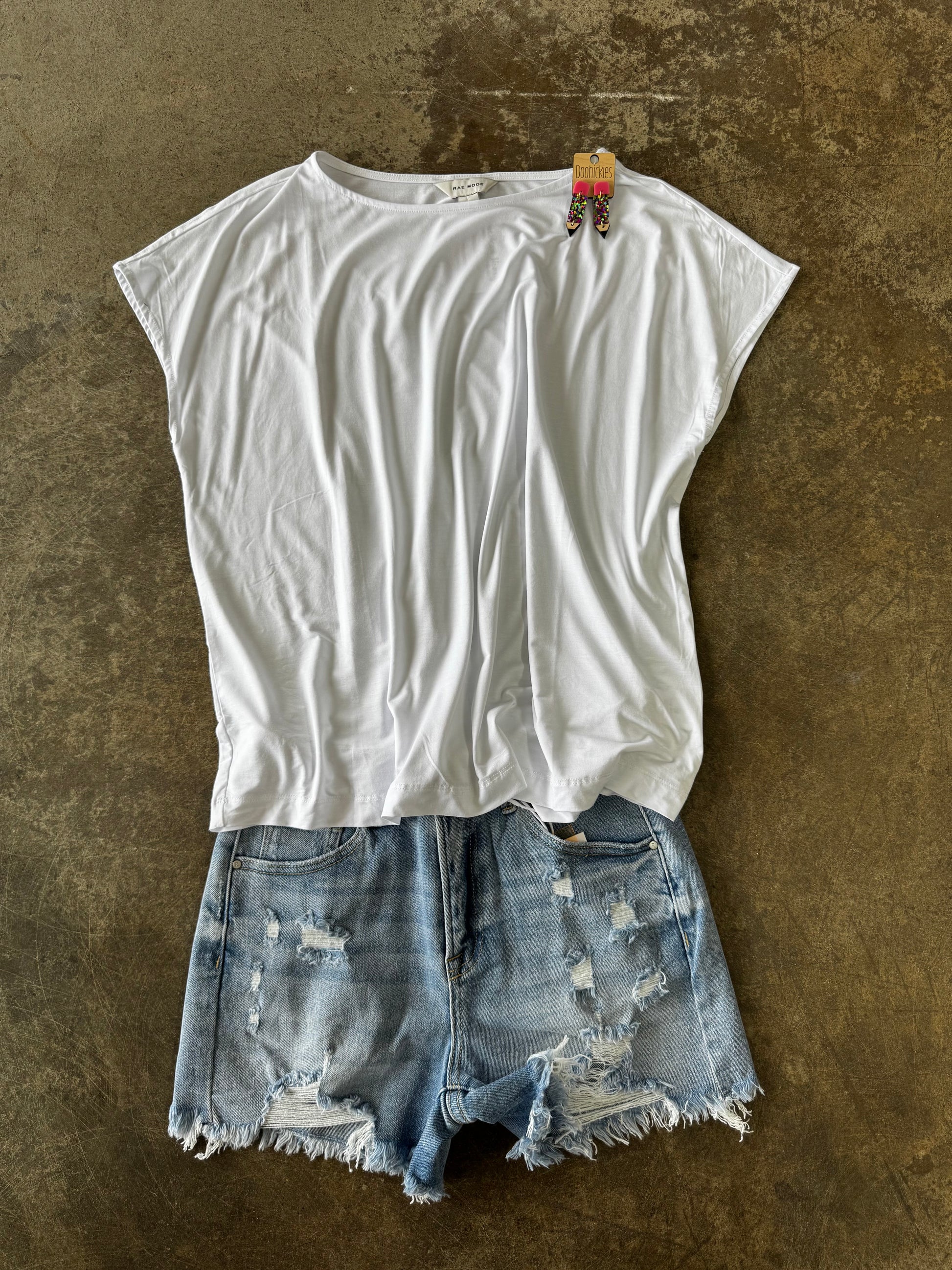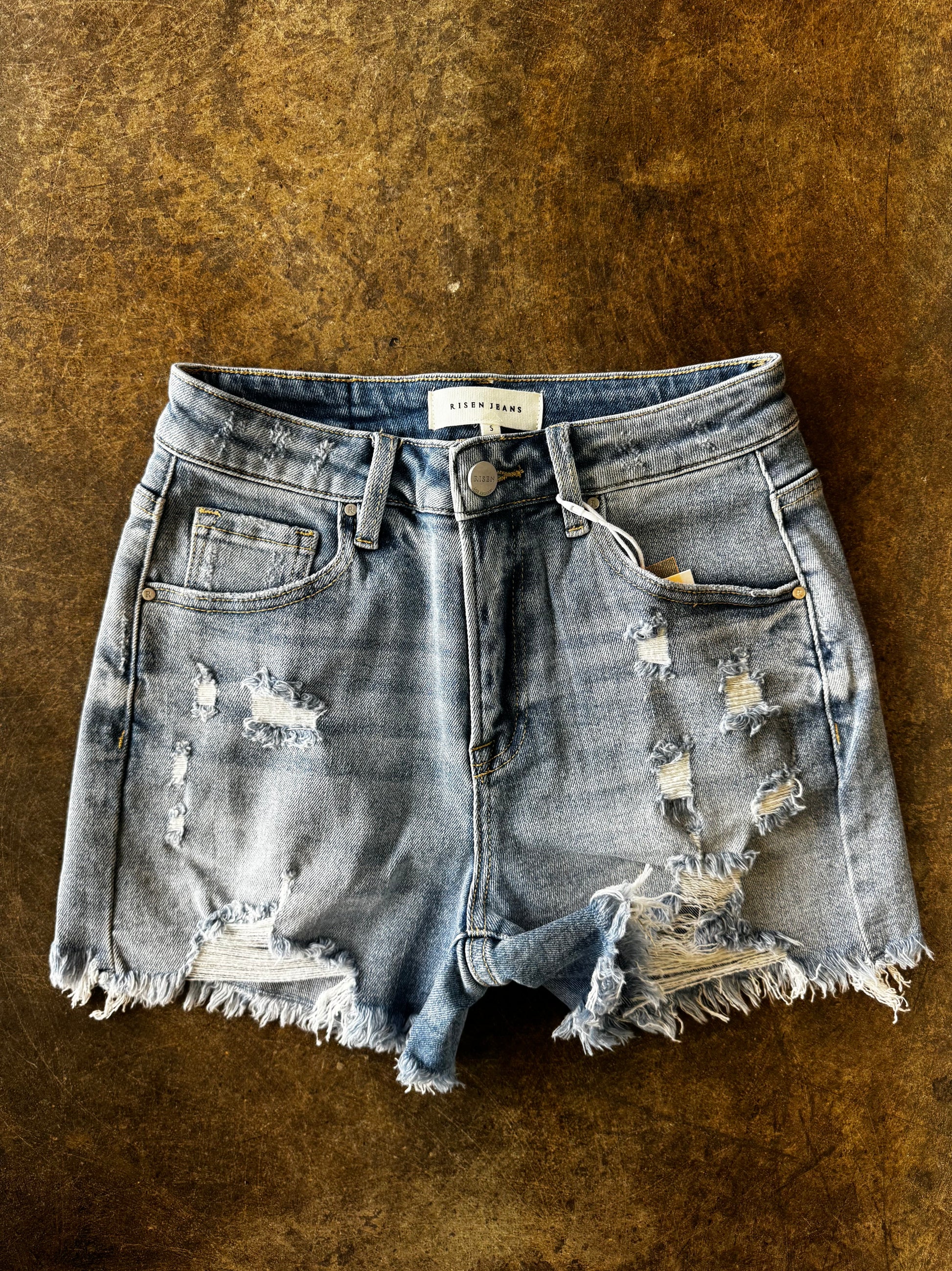 High Rise Distressed Shorts. Light Wash